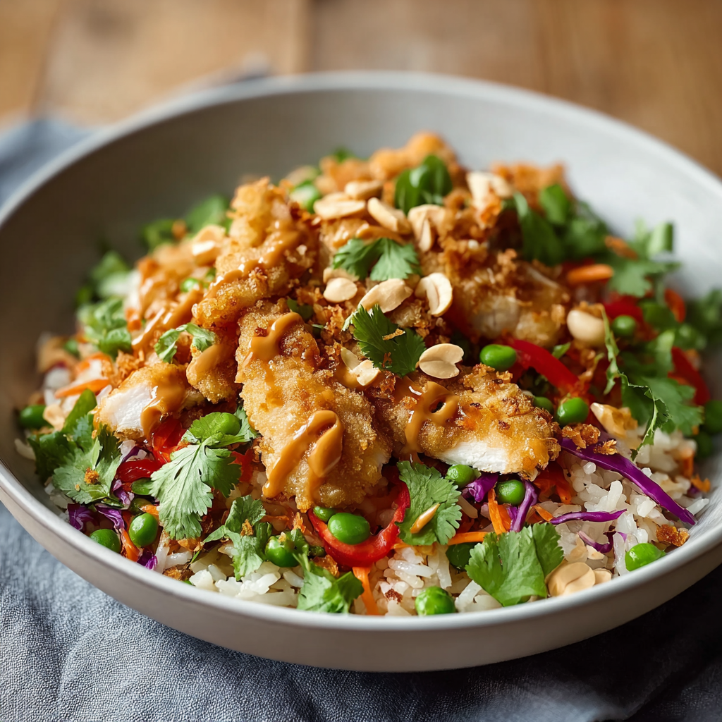 The Chicken Crispy Rice Salad with Peanut Dressing – Easy Healthy Meal is a vibrant, satisfying dish that marries the crunch of fried rice with tender chicken, crisp vegetables, and a rich peanut dressing. Inspired by Asian street food, this recipe offers a modern twist on classic flavors. The secret lies in the golden-fried rice, which is achieved by cooking chilled jasmine rice in hot oil until crispy. Paired with a peanut dressing made of creamy peanut butter, lime juice, and fresh ginger, this meal balances sweet, tangy, and savory notes perfectly. It’s ideal for busy weeknights or healthy meal prep, coming together in under 30 minutes with minimal effort. The result? A restaurant-quality dish you’ll crave again and again.
